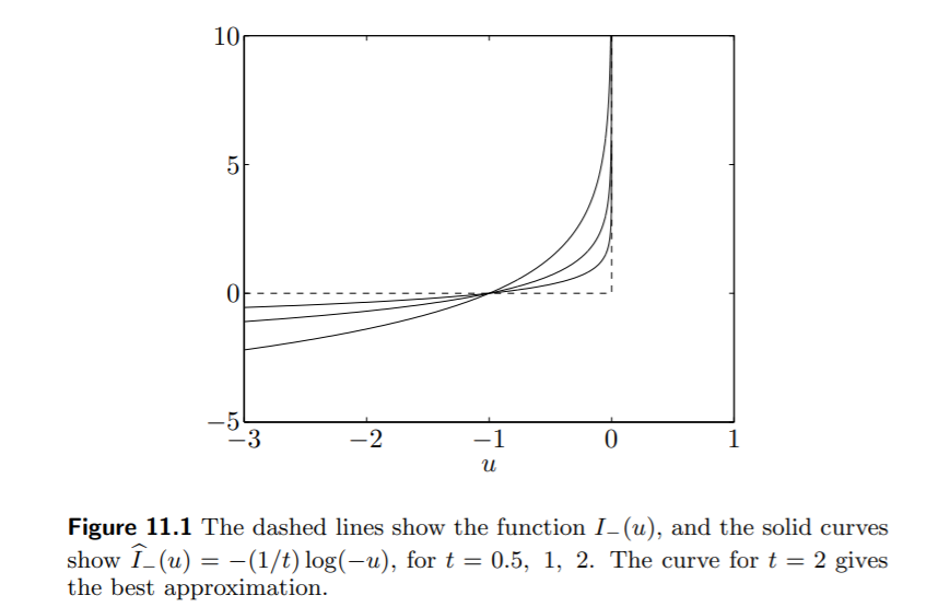 我们的目标是希望消除问题中的不等式约束,障碍函数(barrier function)是一种约束函数值的函数,比如: $$ I_{-}(u)=\left\{\begin{array}{ll}0 & u \leq 0 \\ \infty & u>0\end{array}\right. $$